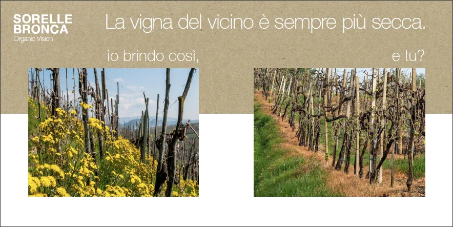 Organic Farming: The below photos depict Sorelle Bronca's organic vineyard on the left and their neighbor's vineyard that is not being farmed organically on the right. The orange stripe under the neighbor's vines shows the use of herbicide.