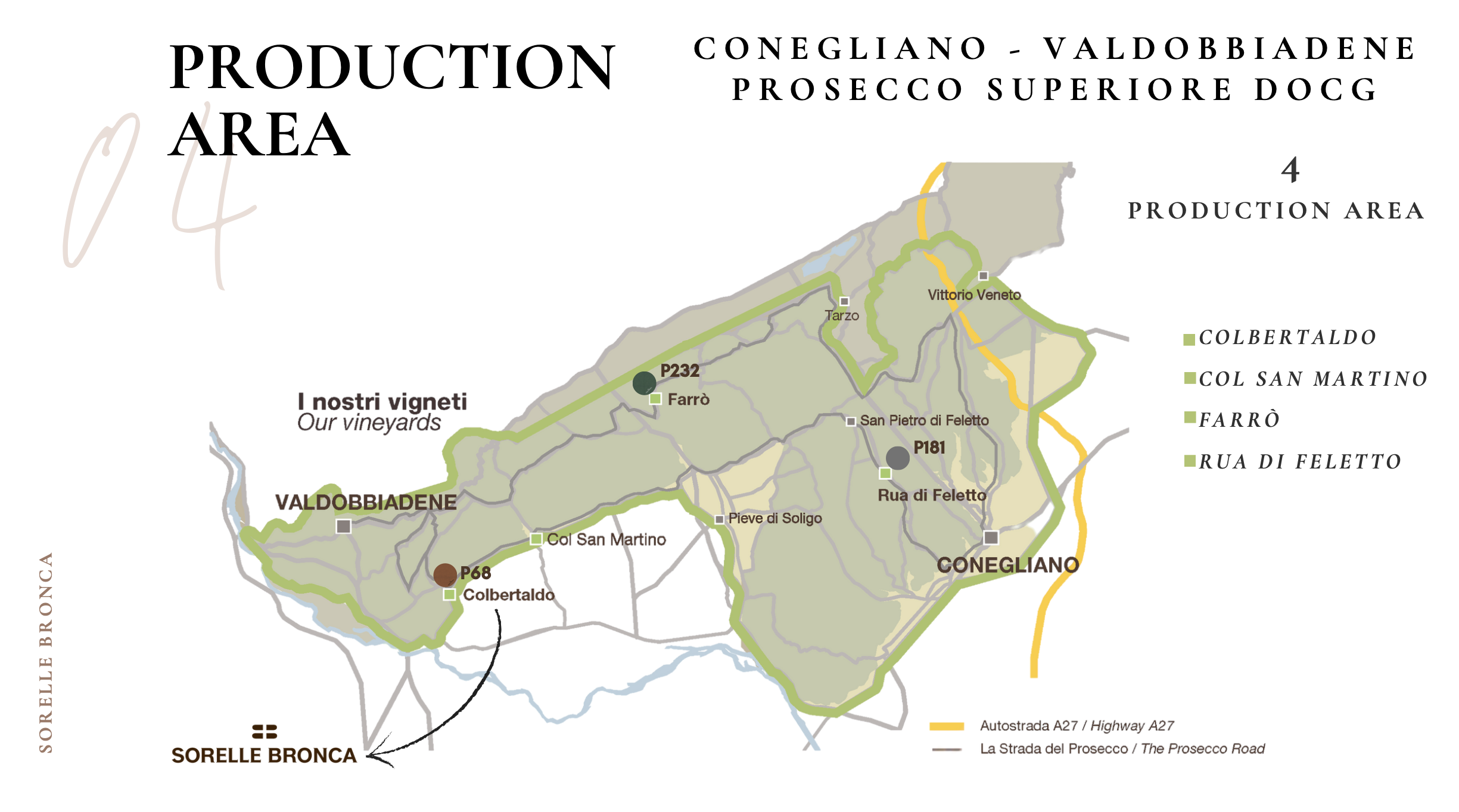 The Bronca Sisters' best vineyard is called Particella 68, as is their reserve wine obtained from that vineyard. The site is perhaps 500 yards from the edge of the Cartizze boundary, the most prized growing area in the Prosecco zone; the wine is made from Prosecco grapes with very small amounts of the other traditional indigenous varieties (Verdisio, Bianchetta, and Perera). In my opinion this wine compares very favorably with the best Cartizze in style and in quality, although it is less expensive.